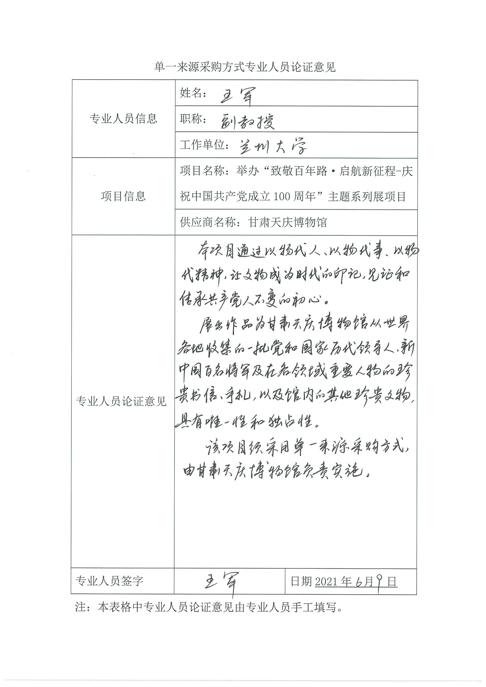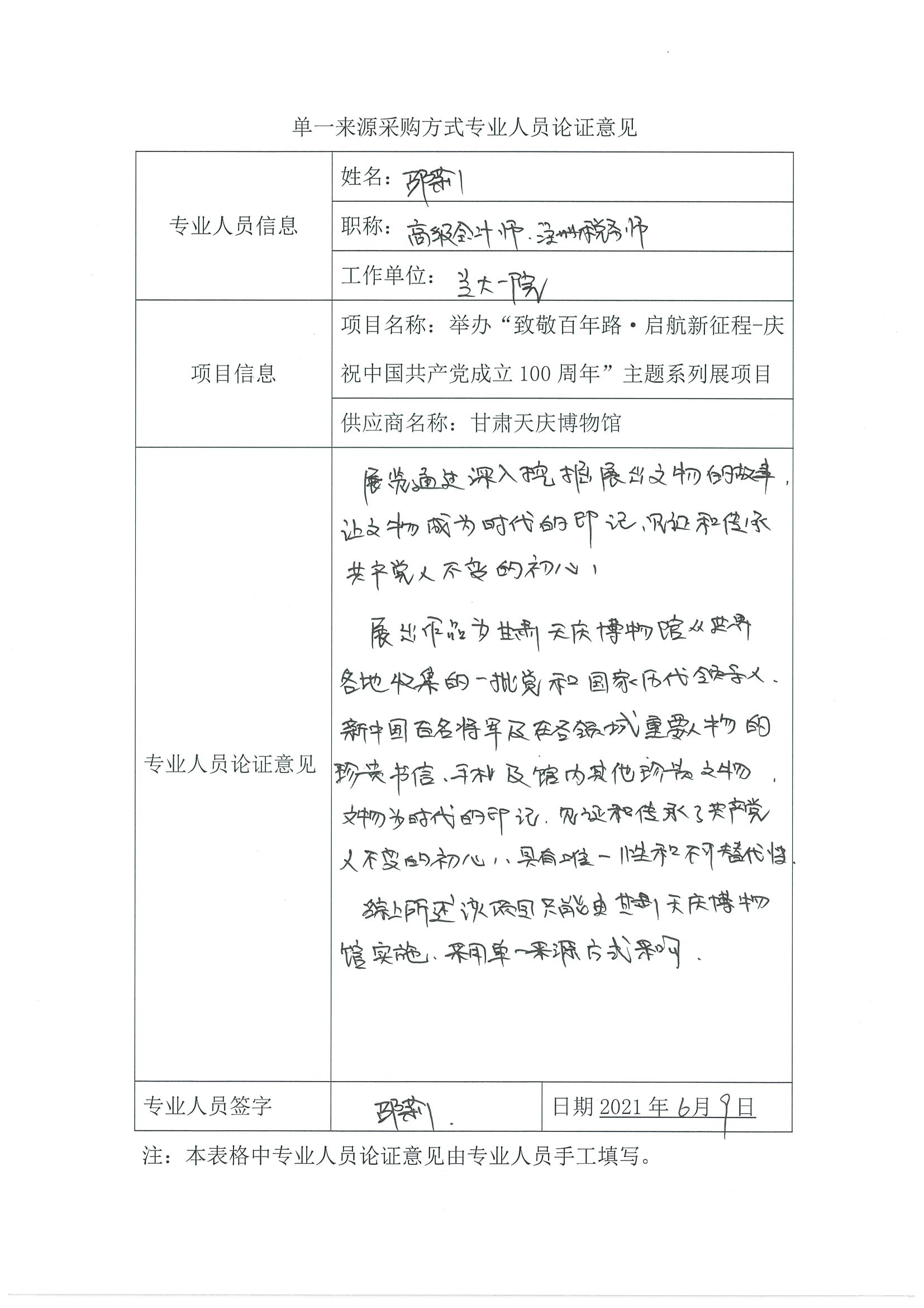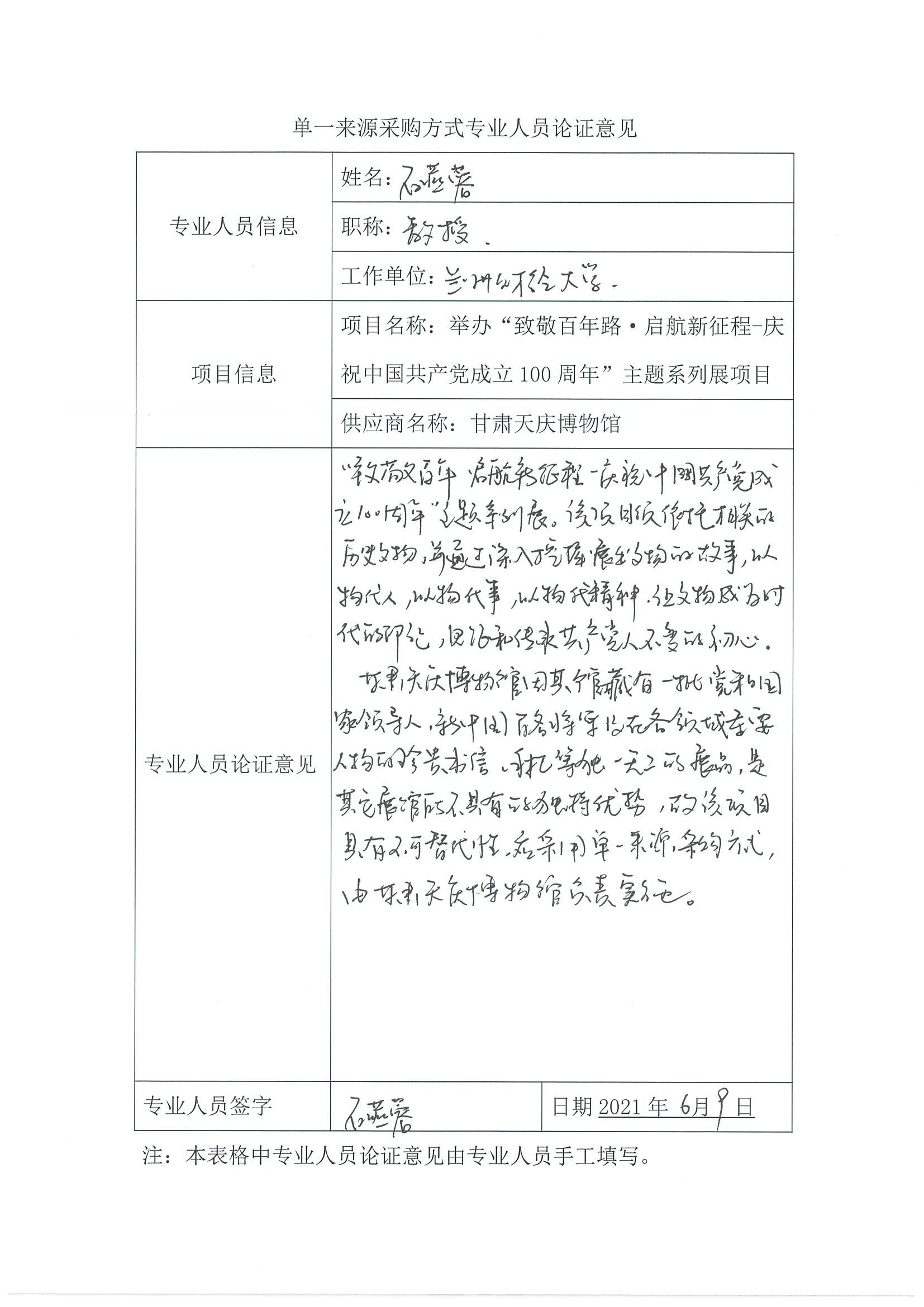 采用單一來(lái)源采購(gòu)方式的原因及說(shuō)明:甘肅天慶博物館作為愛(ài)國(guó)主義教育基地,擬將耗時(shí)數(shù)年從世界各地收集的一批黨和國(guó)家歷代領(lǐng)導(dǎo)人、新中國(guó)百名將軍及在各領(lǐng)域重要人物的珍貴書(shū)信、手札面向社會(huì)公眾展出。此外,還將依托館內(nèi)其它珍貴文物,突出主題、內(nèi)涵豐富,以100年奮斗歷程為主線推出主題系列展,并將通過(guò)深入挖掘展出文物的故事,以物代人、以物代事、以物代精神,讓文物成為時(shí)代的印記,見(jiàn)證和傳承共產(chǎn)黨人不變的初心。同時(shí),也更是對(duì)新時(shí)代“不忘初心,牢記使命”主題教育的持續(xù)落實(shí)。故由甘肅天慶博物館負(fù)責(zé)實(shí)施該項(xiàng)目。
