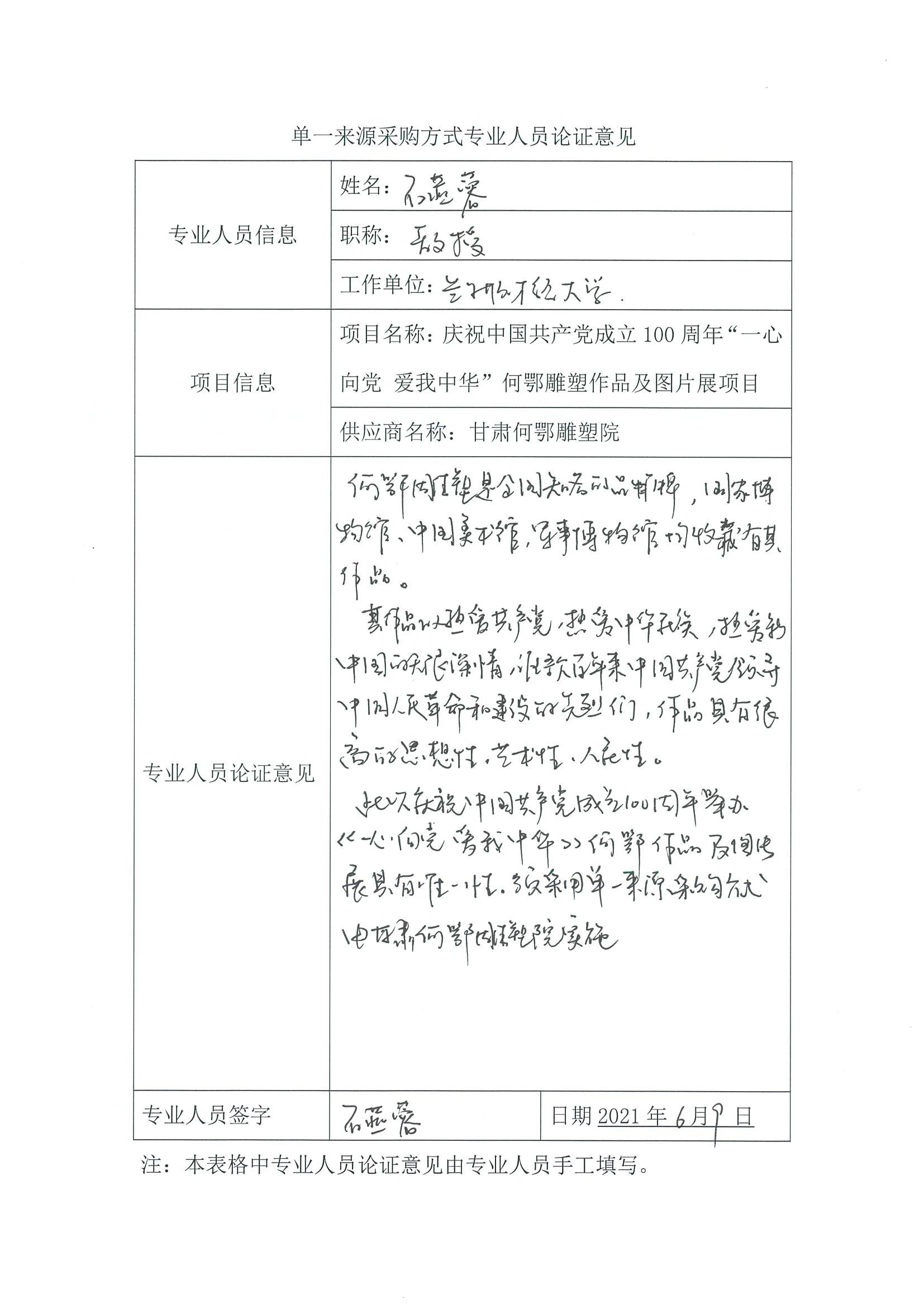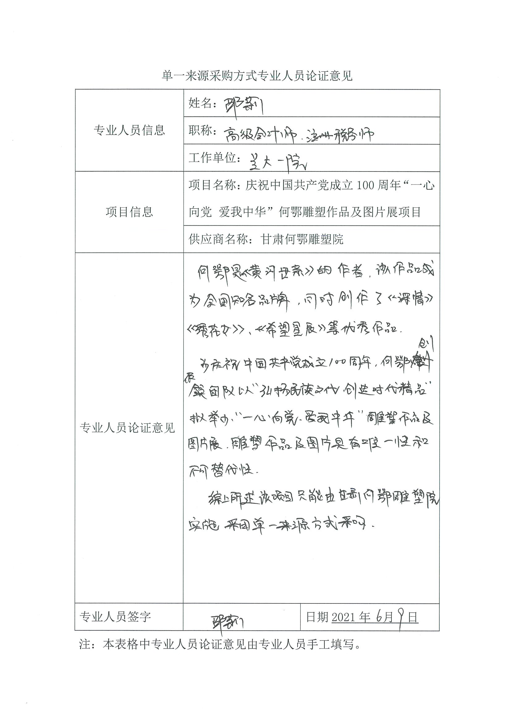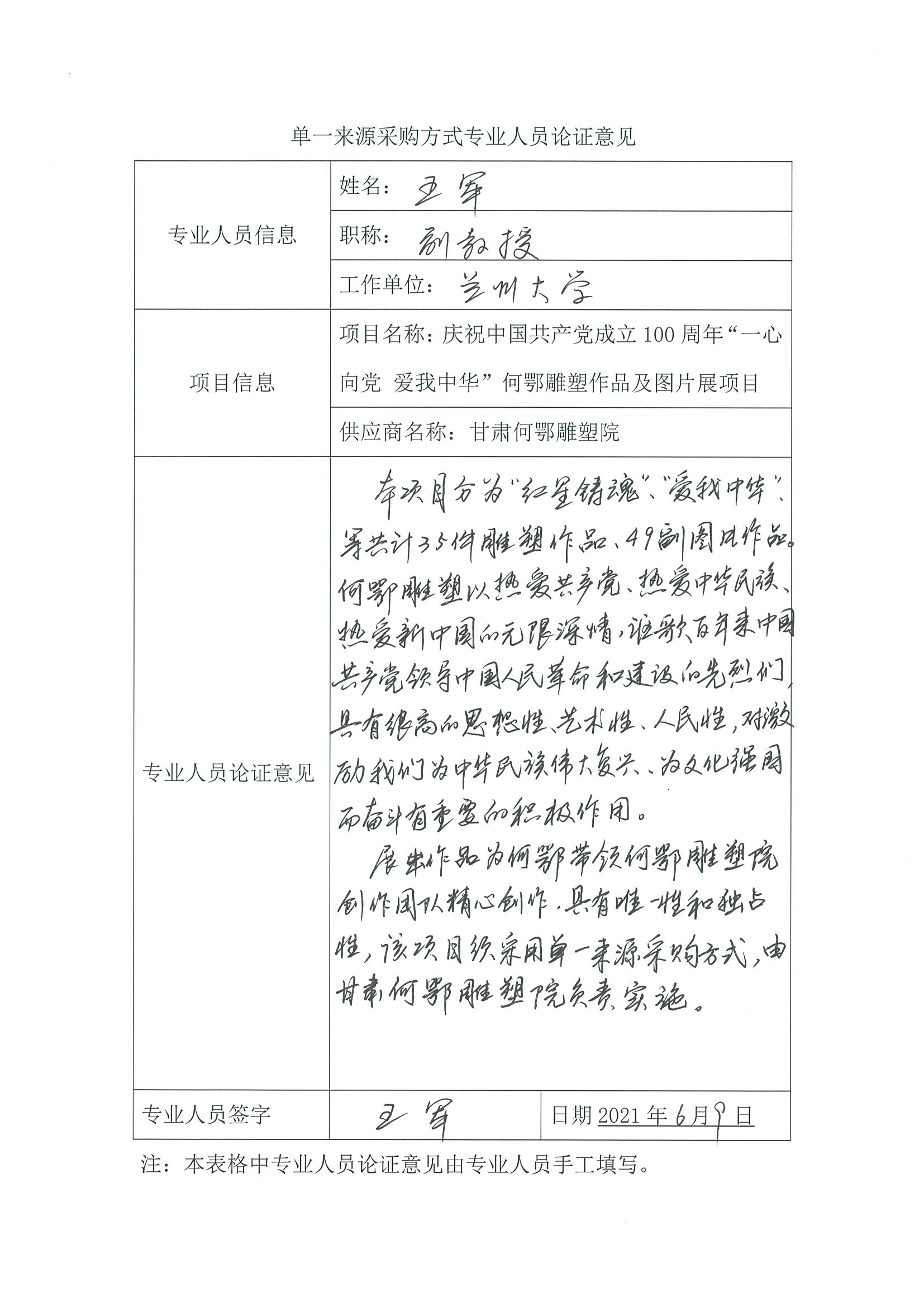 采用單一來源采購方式的原因及說明:何鄂雕塑是全國知名品牌,國家博物館、中國美術(shù)館、軍事博物館均收藏其作品。何鄂雕塑以熱愛共產(chǎn)黨,熱愛中華民族,熱愛新中國的無限深情,謳歌百年來中國共產(chǎn)黨領(lǐng)導(dǎo)中國人民革命和建設(shè)的先烈們。展出的作品具有很高的思想性、藝術(shù)性、人民性。此次“慶祝中國共產(chǎn)黨成立100周年“一心向黨 愛我中華”何鄂雕塑作品及圖片展項目”何鄂雕塑作品及圖片展具有唯一性和獨特性,須采用單一來源采購方式,由甘肅何鄂雕塑院實施。