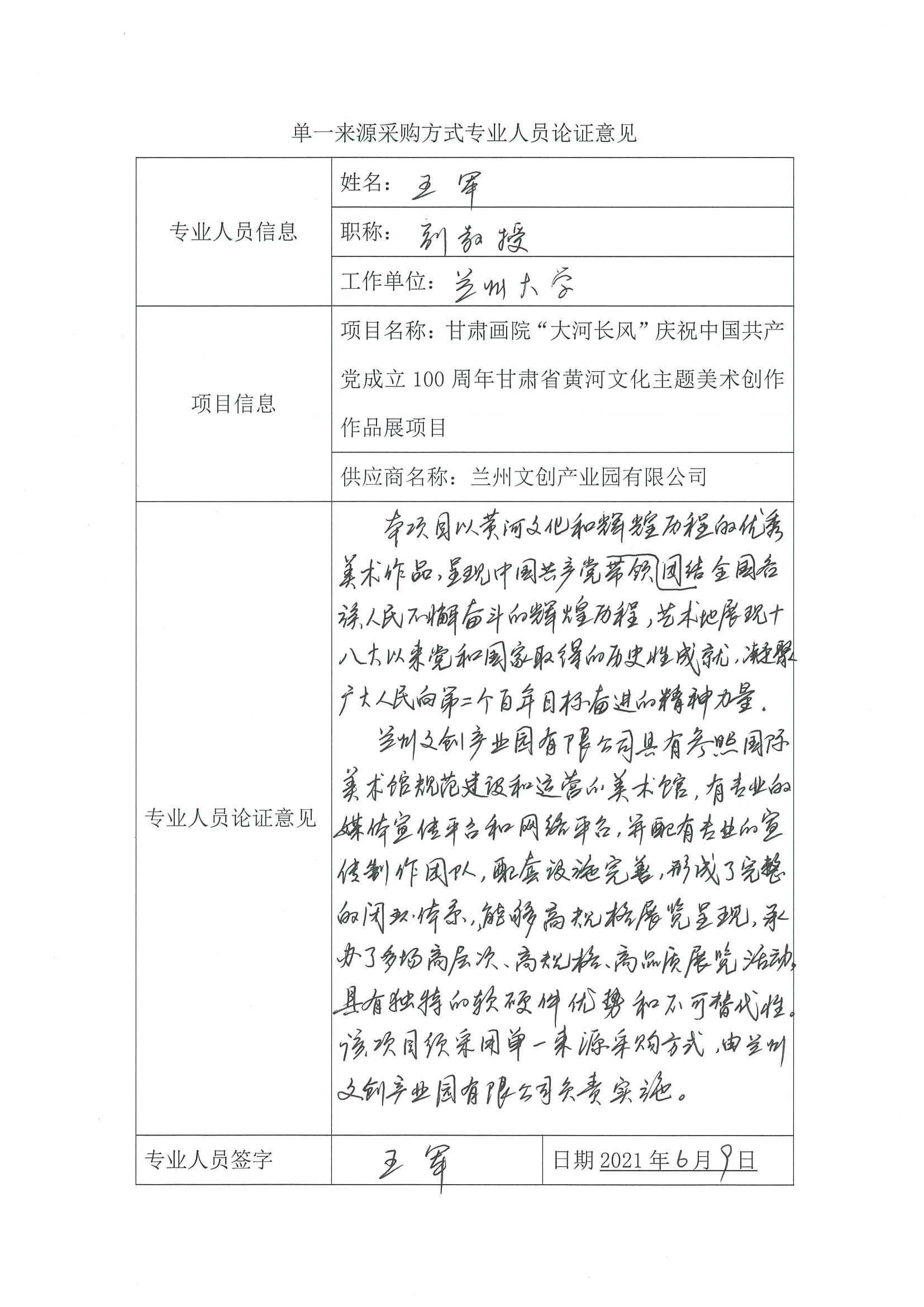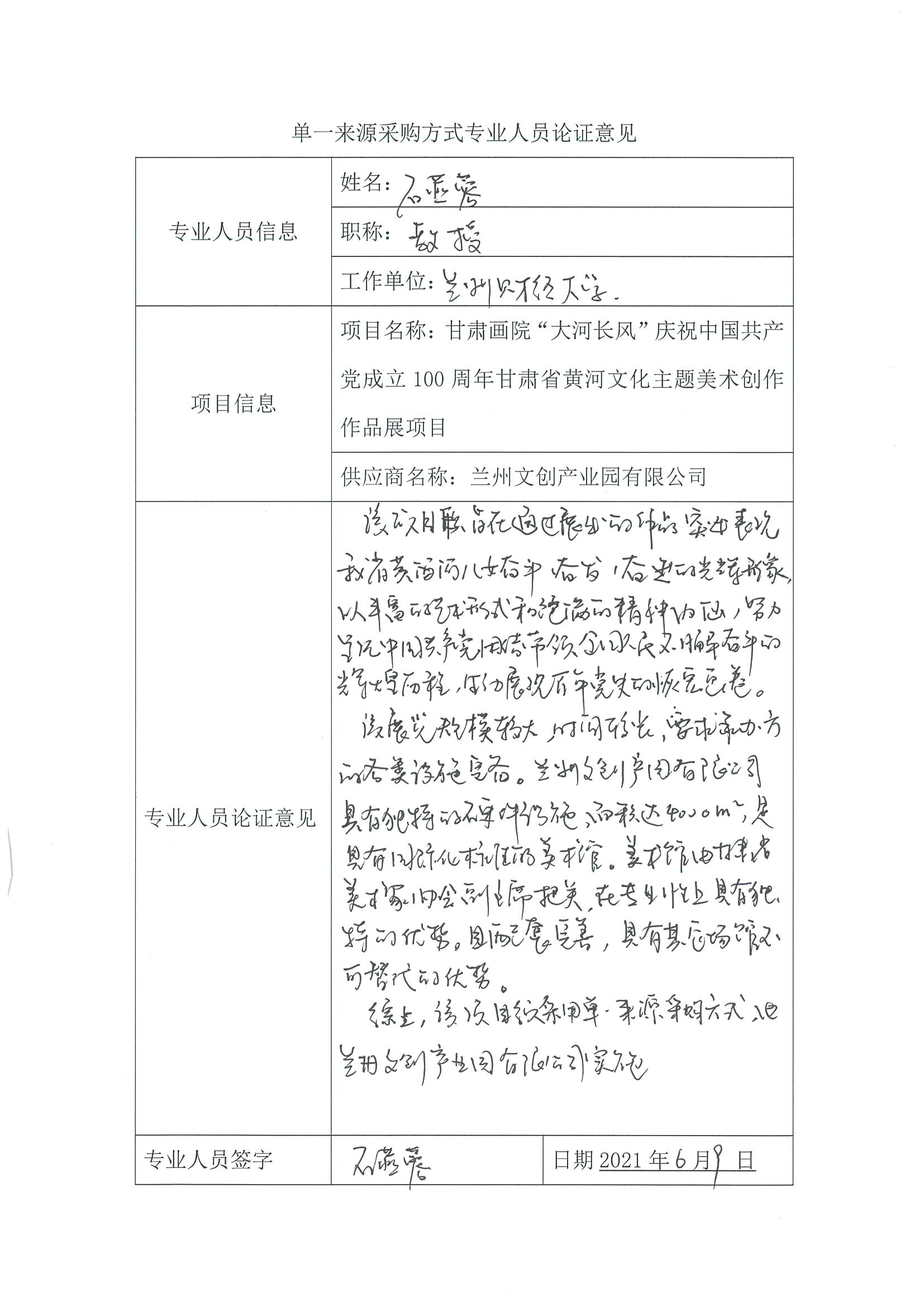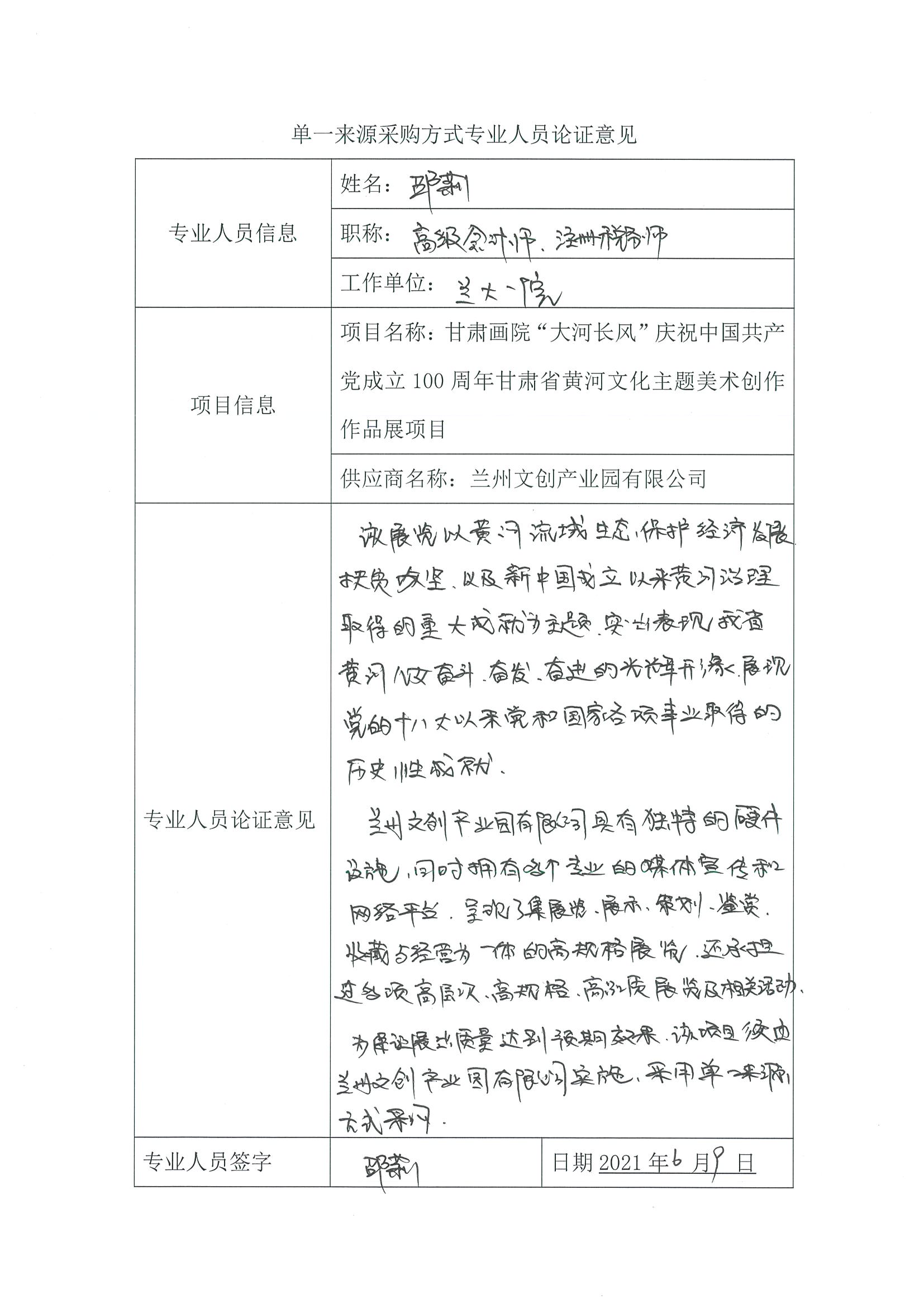 采用單一來源采購方式的原因及說明:該項(xiàng)目只能通過展出的作品突出表現(xiàn)我省黃河兒女奮斗、奮發(fā)、奮進(jìn)的光輝形象,以豐富的藝術(shù)形式和飽滿的精神內(nèi)涵,努力呈現(xiàn)中國共產(chǎn)黨團(tuán)結(jié)帶領(lǐng)全國人民不懈奮斗的輝煌歷程生動(dòng)展現(xiàn)百年黨史的恢弘畫卷。該展覽規(guī)模較大,時(shí)間較長,要求承辦方的各類實(shí)施完備。蘭州文創(chuàng)產(chǎn)業(yè)園有限公司具有獨(dú)特的硬件設(shè)施,面積達(dá)4000㎡,是具有國際化標(biāo)準(zhǔn)的美術(shù)館。美術(shù)館由甘肅省美術(shù)家協(xié)會(huì)副主席把關(guān),在專業(yè)性上具有獨(dú)特的優(yōu)勢,且配套完善,具有其它場館不可替代的優(yōu)勢。綜上,該項(xiàng)目須采用單一來源采購方式,由蘭州文創(chuàng)產(chǎn)業(yè)園有限公司實(shí)施。